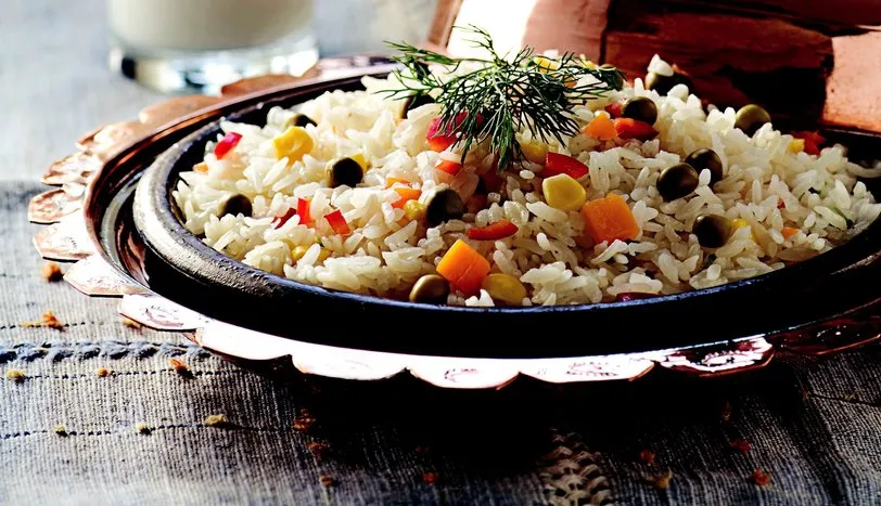 Pirinci yıkayıp sıcak suda 20 dakika bekletin ve süzün. Daha sonra bir tencereye alıp üzerini geçecek kadar sıcak su ve tuz ilave edin. Kapağı kapalı olarak kısık ateşte pişmeye bırakın. Diğer taraftan küp doğranmış havuç ve bezelyeyi ayrı kaplarda yarı yarıya yumuşayana dek haşlayıp süzün. Tereyağını bir tavaya alıp bezelye, havuç ve mısırı birkaç dakika sote edin. Pirinç suyunu yarı yarıya çekince, sebzeli karışımı üzerine ekleyip karıştırın. Tamamen suyunu çekene kadar pişirip ocağı kapatın. Tencerenin üzerine kağıt havlu koyup 10 dakika dinlendirin ve servis yapın.