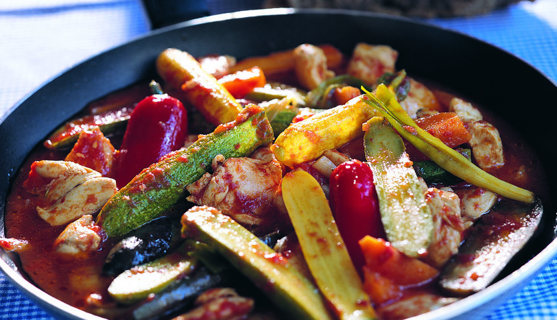 Kuşbaşı tavuğu sıvıyağla tavaya alın. Rengi değişene kadar çevirerek kavurun. Bu arada sebzelerin sapını çıkarın. Kabak, patlıcan ve biberleri boylamasına ikiye bölün. Havucu kibrit çöpünden iri olacak şekilde doğrayın. Tüm sebzeleri, rengi değişen tavukların üzerine alın. 1-2 dakika çevirin. 2 su bardağı domates suyunu ekleyip, tencerenin kapağını kapatın. Pişmeye bırakın. Tencereyi ocaktan almadan 5 dakika önce tuzunu ilave edin. İnce kıyılmış taze soğanları üzerine ekleyin. 5 dakika sonra ocağın altını kapatıp, yemeği servis yapın.
