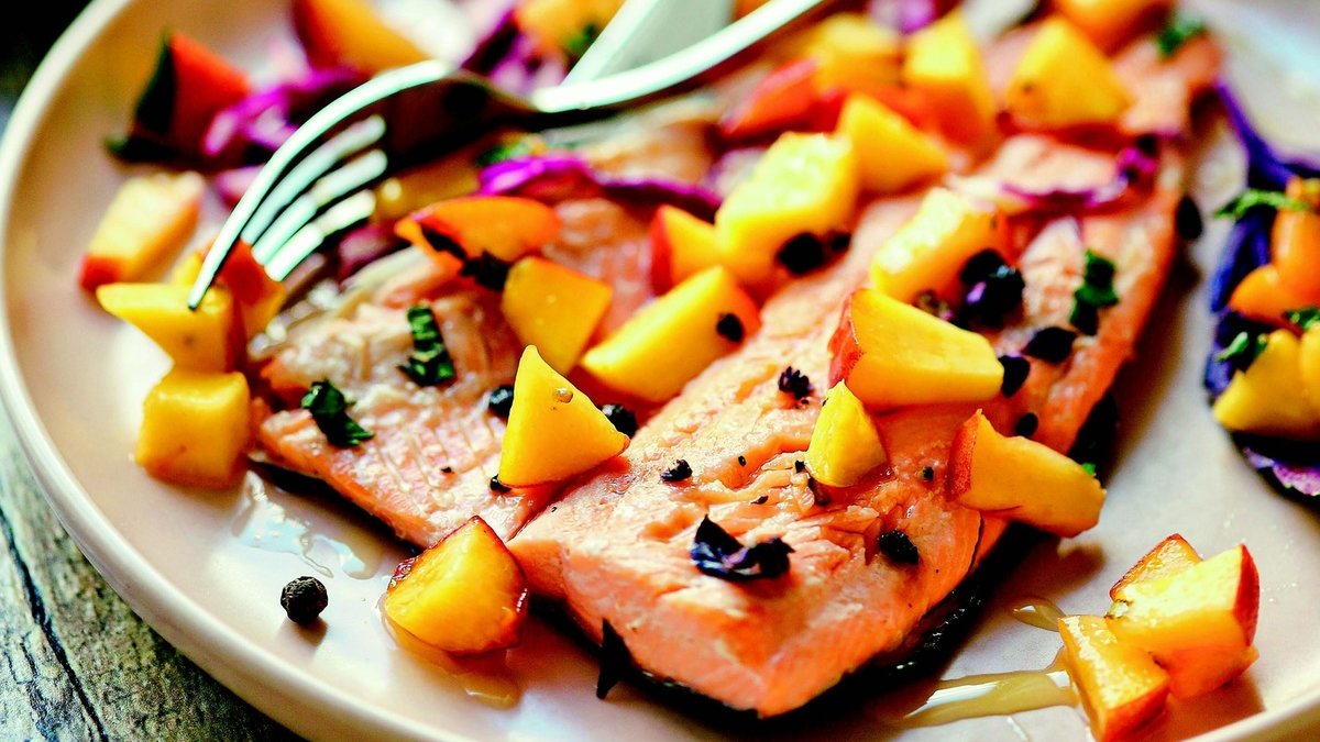 Somonları servis tabaklarına alın. Üzerlerine şeftalili salatayı yerleştirin. Reyhan yapraklarını serpiştirip servis yapın.
