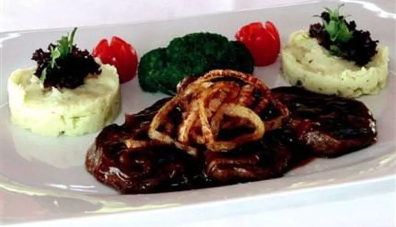PİYAZLIK doğranmış soğanı sıvıyağda kahverengi olana dek soteleyin. Et suyunu ilave edip, 20 dakika pişirin. Dana bifteğe karabiber serperek önceden ısıtılmış tavada istediğiniz şekilde pişirin. Pişmeye yakın tuzunu serpip, ocağın altını kapatın. Bifteği servis tabağına alın. Üzerine sos gezdirip, patates püresi ile servis yapın.