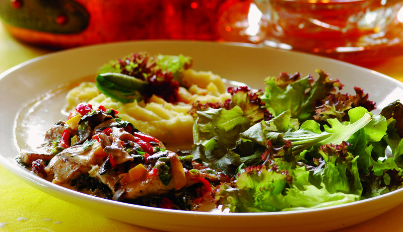 Mantar ve renkli biberleri tereyağında soteleyin. Krema ve şarap ilave edin. Suyunu yarı yarıya çektirin. Somonları ızgarada pişirin. Ispanağı az yağla soteleyin. Biberli malzemeyi ve üzümü ilave edin. Servis için ıspanağı tabağa alın. Üzerine somonu koyun ve sosu gezdirin. Dilerseniz yanında patates püresi ile birlikte servis yapın.