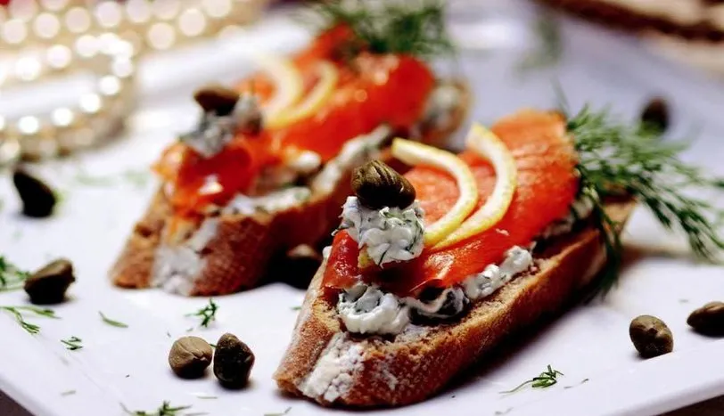 Baget ekmeğin uç kısımlarını kesip çıkarın ve kalanını verev dilimleyin. Derince bir kapta labne peyniri, kapari ve ince kıyılmış dereotunu karıştırın. Bu karışımı ekmeklerin üzerine sürün. Somon dilimlerini ikiye bölün ve ekmeğin üzerine tam oturabilmesi için hafifçe kıvırarak yerleştirin. Somonların üzerine fındık büyüklüğünde labne peyniri koyun. Üzerine birkaç kapari koyun ve ince dilimlenmiş limon kabuğu ile süsleyin. Soğuk servis yapın.