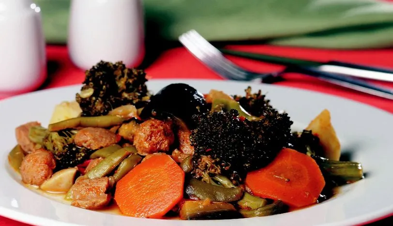 KÜP şeklinde doğranmış soğanı, sivri ve kırmızıbiberleri, mantarları, sarmısakları ve domatesleri zeytinyağında soteleyin. İçine halka şeklinde doğranmış havuç, yarım parmak uzunluğunda kesilmiş patlıcan, dallarına ayrılmış brokoliyi ve soya etini katın. Tuz ve karabiber ilave edin. Sebzelerin üzerini geçecek kadar su koyun. Kısık ateşte soya eti yumuşayana kadar pişirin. Sıcak olarak servis yapın.
