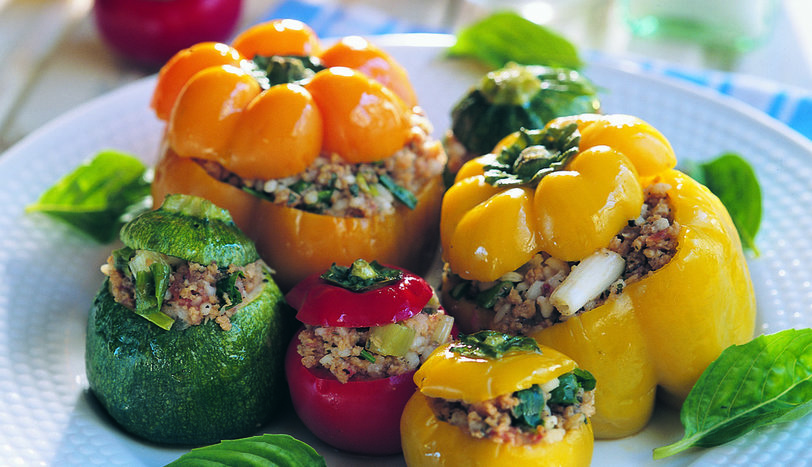 Soya kıymasını 1 bardak sıcak suyla ıslatın. 10 dakika bekletip süzgeçten geçirin. Soğanı küçük doğrayın. Domatesleri rendeleyin. Tüm iç malzemeyi (et suyu tableti hariç) karıştırın. Bu arada kabakların üzerinden kapak kesip, içlerini oyun. Biberlerin de üzerinden kapak çıkarıp, içini temizleyin. Hazırladığınız harcı sebzelere doldurun. Üzerine kapaklarını kapatın. Dolmaları tencereye yerleştirin. İçinde et suyu tableti eritilmiş 2/3 su bardağı sıcak suyu da üzerine dökün. Sebzeler iyice yumuşayana dek pişirin.