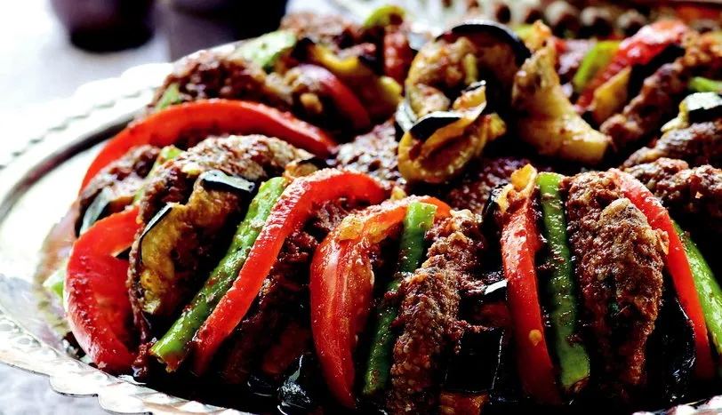 Kıyma, rendelenmiş soğan, kıyılmış maydanoz, tuz ve toz kırmızıbiberi derin bir kaba alıp, yoğurun. Ceviz büyüklüğünde parçalar koparıp, avucunuzun içinde köfteler hazırlayın ve kızdırılmış sıvı yağda kızartın. Patlıcanları alacalı soyup, yuvarlak dilimleyin ve acısının çıkması için tuzlu suda 15 dakika bekletin. Suyunu süzün ve elinizle sıkıp, kuruladıktan sonra kızgın sıvı yağda kızartın. Domatesi halka ve biberi de yarım parmak uzunluğunda doğrayın. Orta büyüklükte ısıya dayanıklı bir fırın kabının içine köfte, patlıcan, domates ve biber olacak şekilde dizin. Köfte ve sebzeler bitene kadar işleme devam edin. Tereyağı ve salçayı bir tavada, kısık ateşte şöyle bir çevirdikten sonra suyu ekleyin. Bir taşım kaynadıktan sonra salçalı suyu yemeğin üzerine gezdirin ve önceden ısıtılmış 200 derece fırında 15 dakika pişirin. Sıcak olarak servis yapın.