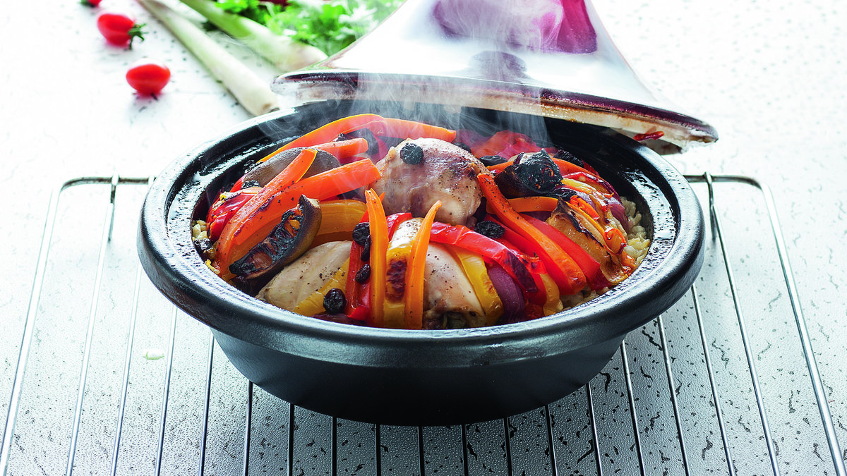 Sıcak suyu ve limon suyunu üzerine gezdirin. Tajinin kapağını kapatın ve önceden ısıtılmış 200 derece fırında 30-40 dakika kapağını açmadan pişirin. Taze kişniş yapraklarıyla süsleyerek sıcak servis yapın.