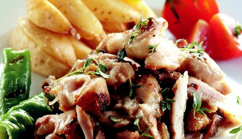 BAHARATLARI ve tuzu karıştırıp, tavuğun her iki tarafına sürün. Zeytinyağı, limon suyu, salça ve sarmısağıbir kapta karıştırıp yine her iki yüzüne sürün. Daha sonra tavuğu, ızgarada ya da fırında pişirin.Piştikten sonra irice doğrayıp servis tabağına alın. Kekik dalları ile süsleyin. Közlenmiş biber, domatesve patates kızartması eşliğinde servis yapın.