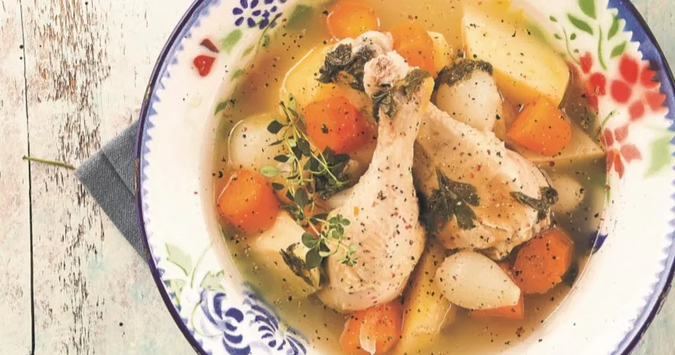 Havuçları soyup irice doğrayın Patatesi soyup dörde bölün. Arpacık soğanları temizleyin. Bagetleri tencereye alıp üzerini geçecek kadar sıcak su, sıvı yağ ve tuz ekleyip 10 dakika pişirin. Üzerine tüm sebzeleri ve sarımsağı ekleyip tavuklar yumuşayana dek pişirin. Maydanozları bütün halde tencereye katıp 5 dakika pişirip ocaktan alın. Karabiber serpip servis yapın.