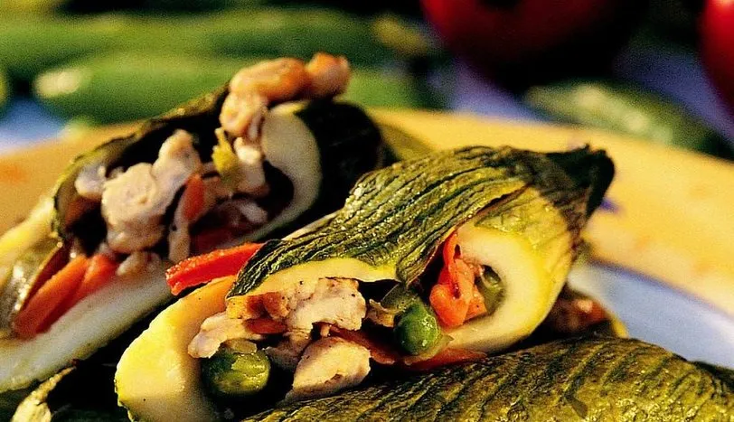 Tavukları ince şerit biçiminde doğrayın. Tavaya sıvıyağı alıp, tavukları kavurun. İnce şerit doğranmış havuç, biber, küp doğranmış soğan ve bezelyeyi ilave edin. Hepsini iyice soteleyin. Daha sonra bir kaşık un serpip, biraz daha kavurun. Tuz, karabiber ve kekik ekleyin. 1 kahve fincanı su ilave edip, sosun koyulaşmasını sağlayın. Diğer tarafta kabakların üzerini kazıyıp 5 dakika haşlayın. Üzerinden boylamasına bir kapak kesin. İçini oyup, fırça yardımı ile sıvıyağ sürün. Tavuklu harcı içine doldurun. 180 derece fırında, kabaklar kızarana dek pişirin. Dilerseniz domates sos ile servis yapın.
