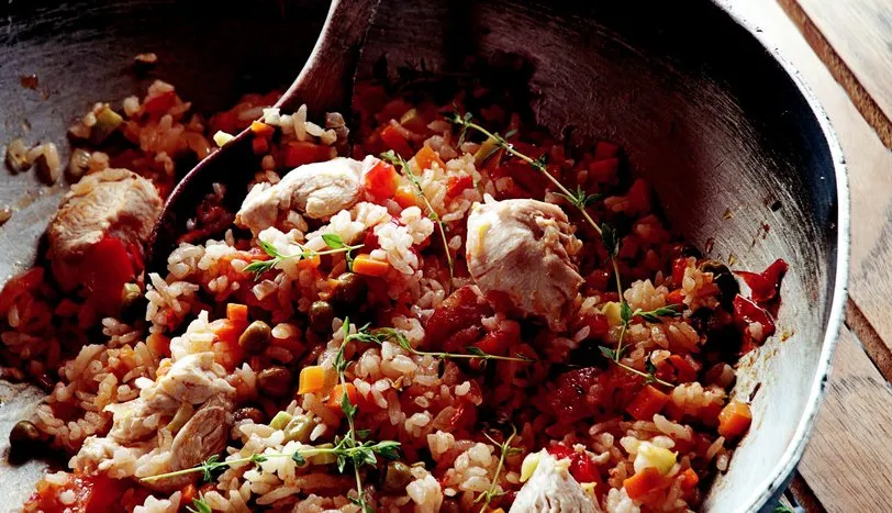Tavuğu sıvı yağda suyunu salıp yeniden çekene dek ara ara karıştırarak soteleyin. Küp doğranmış soğan, domates, kıyılmış biber, bezelye ve sarımsak ekleyip 15 dakika daha kavurun. Pirinci bol su ile yıkayıp üzerine ilave edin. Toz kırmızıbiber, defne yaprağı, karabiber, kekik ve safran ekleyip, tuzunu ayarlayın. Pirincin üzerini bir parmak geçecek kadar sıcak su ilave edip önce harlı ateşte, sonra kısık ateşte göz göz olana dek pişirin. Limon suyuyla karıştırarak servis yapın.