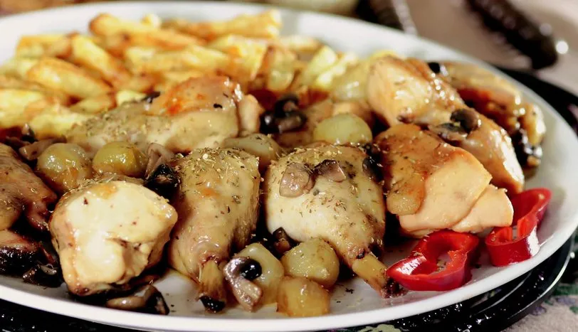 Tavuğu keskin bir bıçakla parçalara ayırıp iyice yıkayın. Bir tencerede margarini eritin. Soğan ve sarımsakları bütün olarak, mantarları iri doğrayarak tencereye alın. Tavuğu ve pul biberi ekleyip kısık ateşte tüm malzemeyi kavurun. İyice kızardıktan sonra suyu ilave edin ve suyunu çekene kadar pişirin. Servis tabağına alarak kekik, tuz ve karabiber serpin. Kabukları soyulup uzunlamasına doğranmış patatesi kızgın sıvı yağda kızartın. Tavukla birlikte servis yapın.AŞÇININ NOTUKekik pişme esnasında yemeğe ilave edilirse acı bir tat vereceği için piştikten sonra katılmalıdır