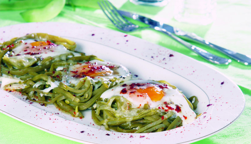 Fasulyeleri ayıkladıktan sonra, kırmadan boylamasına incecik kesin. 3 su bardağı suda 15-20 dakika haşlayıp süzün. Yapışmaz yüzeyli bir tavada tereyağını eritin ve fasulyelerden kuş yuvası formunda 4 öbek oluşturun. Rendelenmiş kaşar peynirini fasulyelerin üzerine serpin ve yumurtaları kırın. Tuz, karabiber ve kırmızıbiber ekleyip, 10 dakika kısık ateşte pişirin. Sıcak servis yapın.