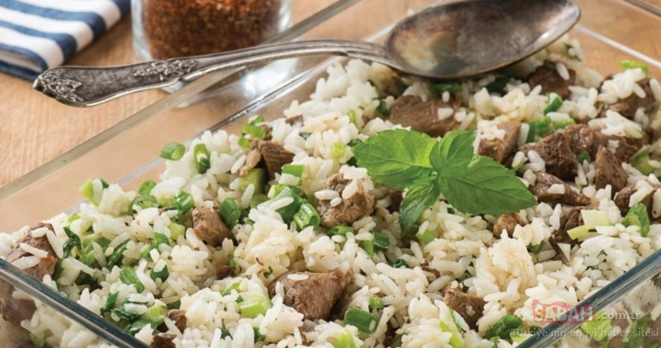 Eti tavaya alıp zeytinyağı ve tereyağı ilave edin ve harlı ateşte mühürleyin. Daha sonra suyunu salıp yeniden çekene dek karıştırın. Ocağın altını kısıp, doğranmış soğan ve sarımsak ilave ederek soteleyin. Sıcak su ilave edip, et iyice yumuşayana dek ara sıra karıştırarak pişirin. Eti orta boy bir fırın kabına yerleştirin. Üzerine iyice yıkanıp suyu süzülmüş pirinci yayın. Üzerine kıyılmış taze soğanı serin, tuz serpin ve sıcak su ilave edin. Üzerini önce pişirme kağıdı sonra alüminyum folyo ile kapatın. Önceden ısıtılmış 160 derece fırında ara sıra kontrol ederek (pilav suyunu çektiği halde pirinç sert ise bir miktar daha sıcak su ekleyerek) pişirin. Fırından alıp, üzerini örterek biraz demlendirin. Sıcak olarak servis yapın.
