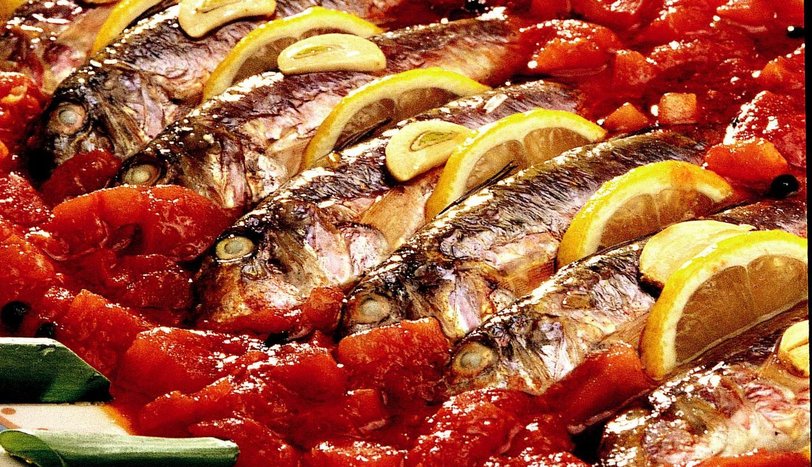 Yağı tavaya alın. 8 eşit parçaya doğranmış sarımsağı, karabiberleri, iri doğranmış domatesleri, defne yapraklarını ve tuzu tavaya alıp 5 dakika soteleyin. Bu malzemeyi balıkların aralarına dökün. 180 derece fırında 30 dakika pişirip, sıcak servis yapın. - 2