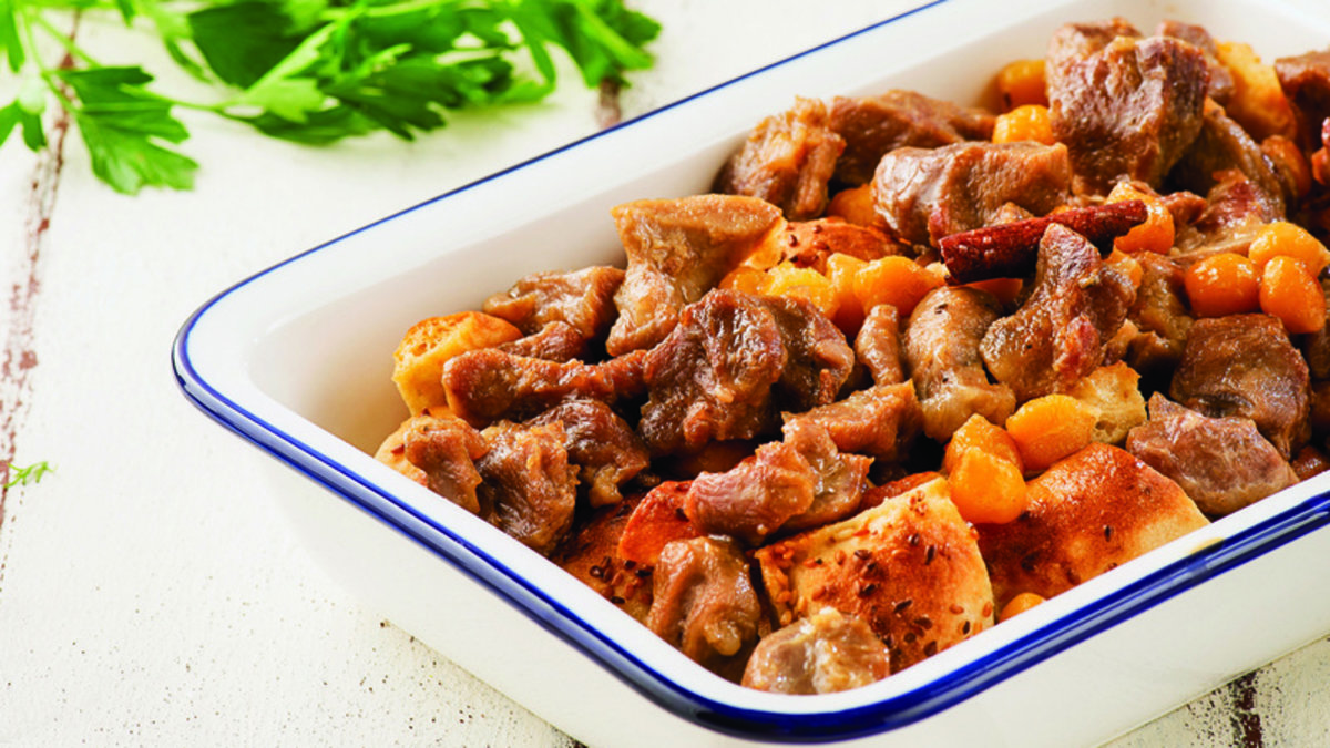 Tereyağının üçte birini derin bir tencereye alıp ısıtın ve eti ekleyip orta ısıda kavurun. Et suyunu salıp çektikten sonra su ve nohudu ekleyin. Damla sakızı ve kakuleyi havanda ayrı ayrı dövün. Tüm baharatları, tuzu ve tarçını ete ekleyip pişene kadar kavurmaya devam edin. Tırnak pideleri küp doğrayın ve bir fırın kabına yerleştirin.