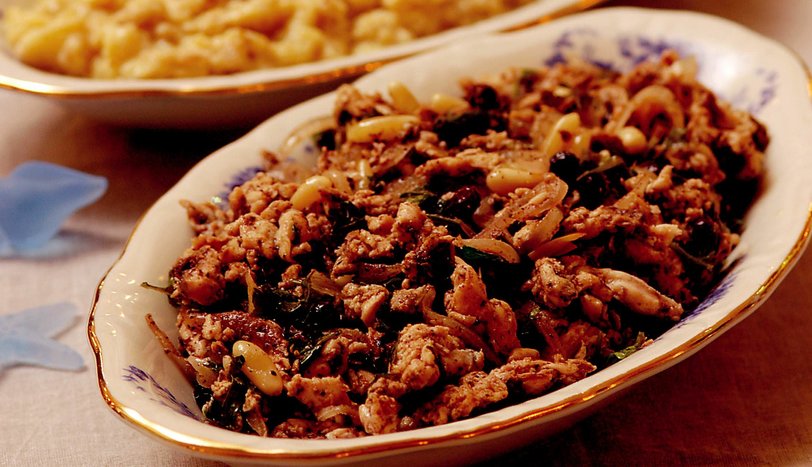 Balıkların deri ve kılçığını temizleyip, incecik doğrayın. Soğanı yemeklik doğrayıp ayçiçek yağında sararana dek kavurun. Üzerine balık, dolmalık fıstık, kuş üzümü, yenibahar, tuz ve karabiber ekleyin. Balıklar yumuşayana kadar pişirin. ince kıyılmış maydanoz ekleyip, malzemeyi soğumaya bırakın. Daha sonra limon suyu ilavesi ile servis yapın.