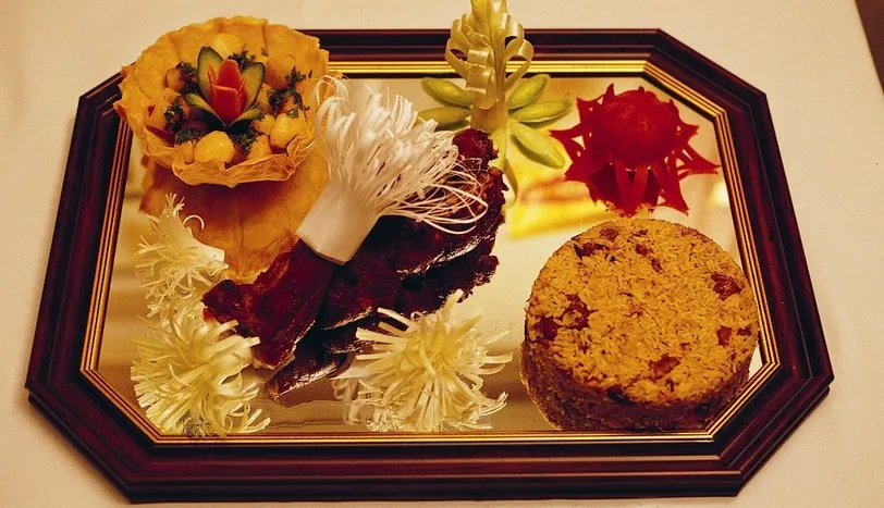 HAVUÇ, yerelması, mantar ve maydanozu ayıklayın. Maydanoz ve sarmısakları ince kıyın. 3 adet yerelmasını rendeleyin. Kalanları bütün halde bırakın. Mantarları küçük doğrayın. Havucu çok az haşlayın. Kestaneleri sıvıyağda kavurun. Eti yıkayıp, dövün. Tuz ve limonla hafifçe ovun. Etin üzerine tuz, karabiber, ince kıyılmış sarmısak, rendelenmiş yerelması, mantar ve hafif haşlanmış havucu koyun. Eti rulo şeklinde sarıp, iple bağlayın. Dışını tuz ve limon suyu ile ovun. Tepsiye yerleştirip, üzerine tereyağının üçte birini dilim olarak sıralayın. 3 su bardağı su ile 175 derece fırında kızartın. Tencereye etsuyu tableti katılmış su, şeker, tuz, limon suyu, kalan tereyağının yarısı, süt ve unu koyup, karıştırın. Karışım kaynayınca soyulmuş ve bütün halde bırakılmış yerelmalarını içine atın. Orta ateşte yerelmaları yumuşayıncaya dek pişirin. Ayrı bir yerde pirinci ayıklayıp, bir saat ılık tuzlu suda bekletin. Nişastası gidene dek yıkayın. Havucu rendeleyip, soğanı ince doğrayın. Tereyağının kalanını, kestanelerin kavrulduğu sıvıyağla karıştırın. Soğan ve havucu yağda sararana dek kavurun. Kestaneleri ve pirinci ekleyip, etsuyu tableti katın. İki buçuk su bardağı kaynar su ve safran ilave edip, suyunu çekene dek pişirin ve demlenmeye bırakın. Yarım su bardağı sıvıyağ, limon suyu, maydanoz, pulbiberle sos hazırlayın. Yerelmalarını bu sosa batırıp, önceden hazırlanmış yufkadan tabakların içine pilavla birlikte yerleştirin. Yemeği garnitürü ile birlikte servis yapın