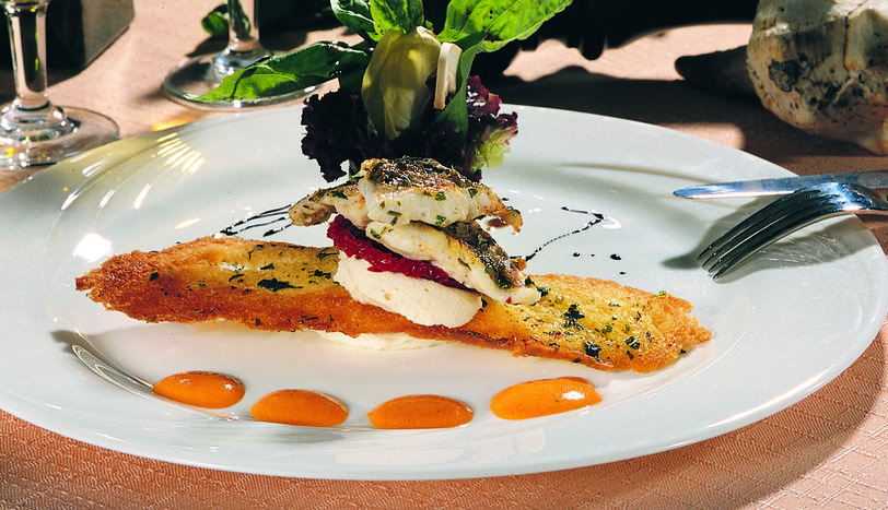Fileto edilmiş mercan balıklarını, taze baharatlar, zeytinyağı, tuz ve karabiberden oluşan karışımın içinde 2 gün buzdolabında dinlendirin. Sonrasında marine edilmiş mercanları çok az sıvı yağa koyup tavada kızartın. Karnabahar terin için, ince doğranmış soğan ve karnabaharı tereyağında soteleyin. Üzerine 2 bardak balık suyunu ilave edip, kaynatın. Kremanın yarısını ekleyip, püre haline getirin. Ayrı bir yerde kremanın kalanını köpürtün. İçine püreyi ve sıcak suda eritilmiş jelatini ilave ederek buzdolabında dinlenmeye bırakın. Servis tabağının ortasına önce karnabahar terin koyup üzerine ekmek kıtırını yerleştirin. Daha sonra tekrar karnabahar terin ve en üste tavada kızartılmış mercan balıklarını koyun. Yeşillikler, kırmızı biber sos ve balzamik sirke ile servis yapın.