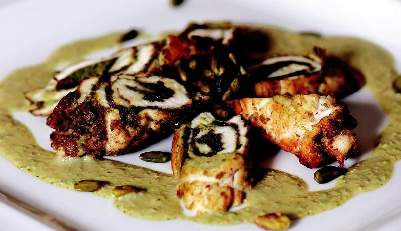 TAVUK göğsünü ortadan ikiye kesin. Üzerine streç film serip döverek inceltin. Tuz, karabiber ve antepfıstığın yarısını üzerine serperek rulo şeklinde sarıp kınnap ipi ile bağlayın. Kızdırılmış sıvıyağda her tarafını kızartın. Servis tabağına alıp dilimleyin. Diğer tarafta tereyağı ile unu kavurun. İçine kalan antep fıstığı ve tavuk suyunu ilave edip karıştırın. Hazırladığınız sosu tavuğun üzerine gezdirip servis yapın.