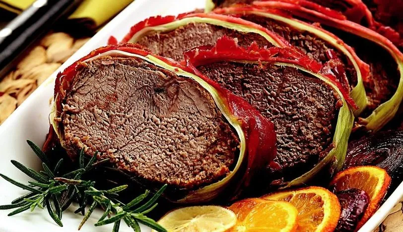 ETİ yıkayıp her tarafını tuzlayın. Tereyağını geniş bir tencereye alıp eritin ve eti tencereye koyun. Çevirerek her tarafı pembeleşinceye kadar kızartın. Üzerine 8'e bölünmüş soğan, sarmısak, irice doğranmış havuç, defne yaprağı ve tane karabiber ilave edin. Soğanın rengi dönene kadar etle birlikte kavurun. Tencereye sıcak su ekleyip kapağını kapatın. 2 saat kısık ateşte pişirdikten sonra etin diğer tarafını çevirin. Çok kısık ateşte uç buçuk saat daha pişirin. Daha sonra tencereden alıp dinlendirin. Pırasanın kök kısmını bir parmak kesin. Üzerine boydan boya bir çizik atın ve dış yapraklarından 3-4 tanesini zedelemeden çıkarın. Yaprakları 2-3 parmak eninde uzun şeritler halinde kesip tuzlu suda yumuşayana kadar haşlayın. Ardından soğuk sudan geçirin. Pişen eti önce jambonla, sonra pırasa yaprakları ile sarın. En üste pastırmaları koyun. Malzemeleri sabitlemek için mutfak ipiyle boydan boya bağlayın ve bir fırın tepsisine yerleştirin. Soğanları ve portakalları halka doğrayıp tepsinin kenarlarına yerleştirin. Önceden ısıtılmış 200 derece fırında 10 dakika pişirin. Fırından alıp servis tabağına aktarın. İpi çıkarın ve eti dilimleyin. Etrafına soğan ve portakal halkaları ile haşlanmış brokoli yerleştirin