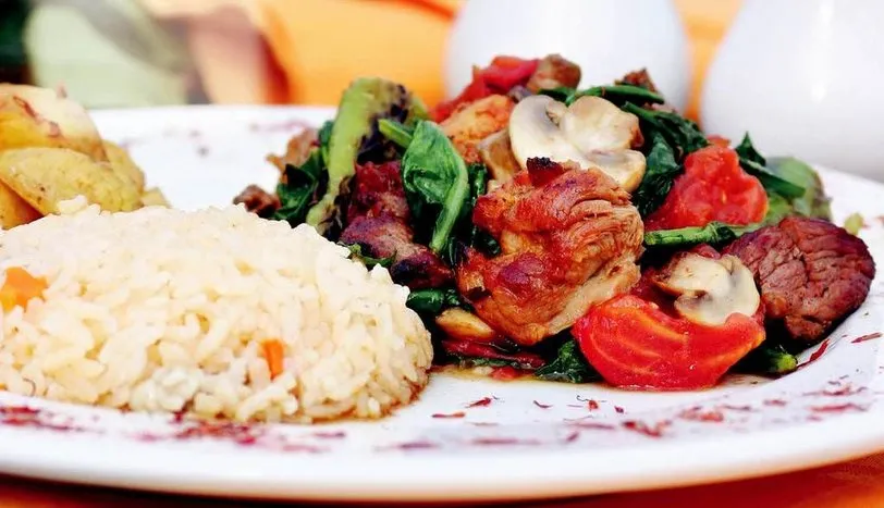 Domatesleri ve biberleri ikiye bölüp közleyin. Daha sonra kabuklarını soyup kenara alın. Tavuk ve kuzu etlerini kuşbaşından biraz daha iri doğrayıp ızgarada pişirin. Daha sonra her parçayı ikiye bölüp bir tavaya alın. Üzerine zeytinyağı ve sarmısak ekleyip 1-2 dakika kavurun. Doğranmış mantarı ilave edip 5 dakika daha pişirin. Domates ve biberi yeniden ikiye bölüp tavaya ekleyin. İri doğranmış roka, balzamik sirke ve soya sosunu ilave edin. Tuzunu ayarlayın. Rokanın rengi dönene kadar pişirip ocaktan alın. Etli pilavla birlikte servis yapın.