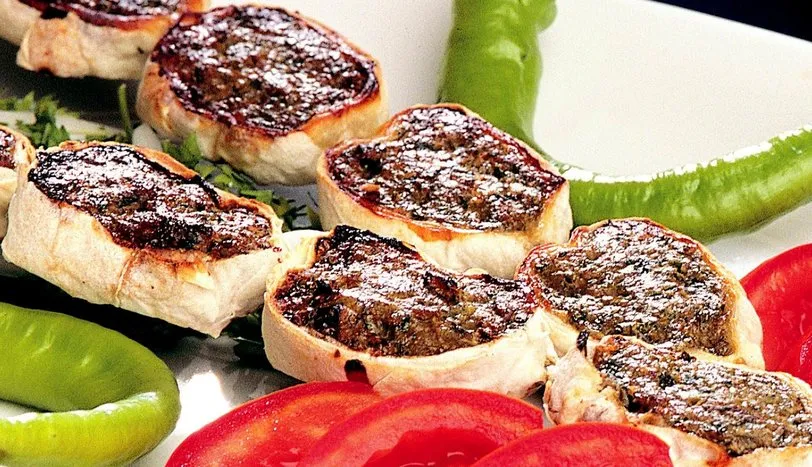 Yufka ve çekilmiş fıstık hariç tüm malzemeyi bir kapta karıştırın. Bu karışımı kıyma makinesi veya mutfak robotunda çekin. Başka bir kaba alarak fıstığı ilave edip, iyice yoğurun. Bu köfte harcını ikiye ayırın. Rulo şekline getirip, yufkalara sarın. Bu şekilde en az yarım saat buzdolabında bekletin. Sonra 1 cm eninde halkalar keserek, şişlere geçirin. Kömür ateşinde veya fırın ızgarasında pişirip, servis yapın.