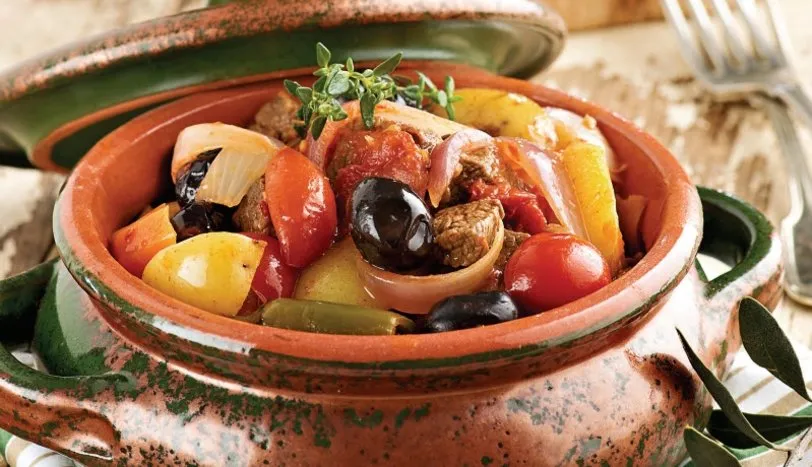 Zeytinin fazla tuzunu almak için ılık suda 5 dakika bekletin. Aynı işlemi 1- 2 kez daha tekrarlayın ve süzüp kenara alın. Eti bir tencereye alıp suyunu salıp çekene dek kavurun. Üzerini geçecek kadar su ilave edip yumuşayana dek haşlayın. Patatesleri soyup elma dilimi şeklinde kesin ve geniş bir kaba alın. Üzerine irice doğranmış soğan, havuç, biber ve domates ekleyin. Et, zeytinyağı, kıyılmış kekik, tuz, karabiber ve pul biber ilave edip harmanladıktan sonra güveç kabına aktarın. Salçayı 1 su bardağı sıcak suda açıp malzemenin üzerine gezdirin. Tereyağını küçük parçalara ayırıp en üste koyun. Güveci alüminyum folyo ile kaplayın. Önceden ısıtılmış 180 derece fırında bir buçuk saat pişirin. Folyoyu alıp, 10 dakika daha pişirdikten sonra servis yapın.