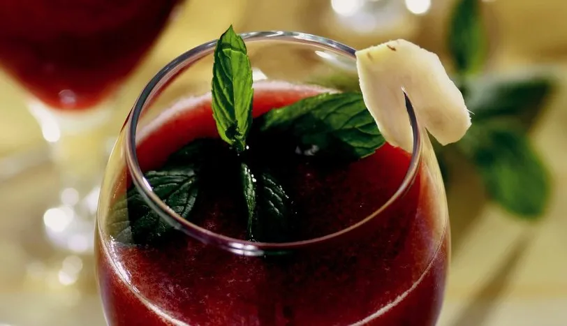 Çekirdekleri çıkarılmış kiraz, vişne, şeftali, dilimlenmiş kavun ve taze naneyi esmer şekerle birlikte önce blenderden, daha sonra süzgeçten geçirip sürahiye alın. İçine maden suyu ve taze zencefil ilave edip bütün malzemeyi karıştırın. Buzdolabında 1-2 saat beklettikten sonra bardaklara paylaştırıp soğuk olarak servis yapın.