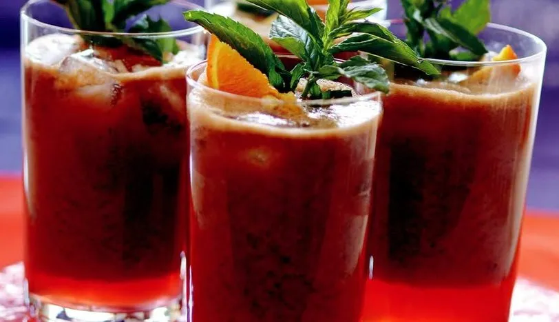 Üzüm ve portakalı ayrı olarak katı meyve sıkacağından geçirin.Çıkan suları ayrı bir yerde karıştırın.Üzerine kıyılmış nane serpiştirip yeniden karıştırın.