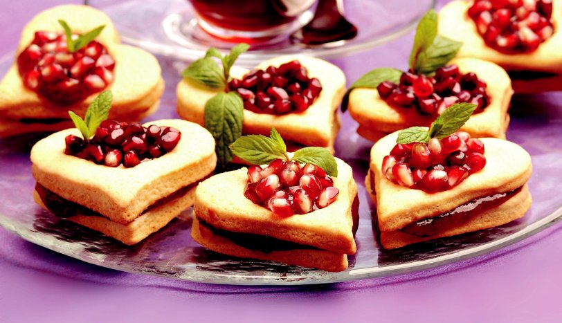 Diğer yandan, buzdolabında beklettiğiniz şekerli meyve tenceresini ocağa oturtun. Kısık ateşte kıvam alana dek pişirin. Ocaktan alıp kevgirden geçirin. Narlı karışım soğuduktan sonra büyük kalp kurabiyelerin üzerine sürüp, küçükleri üzerine yapıştırın. Kurabiyelerin ortalarındaki boşluklara da aynı karışımdan koyun. Nar taneleri ekleyerek servis yapın.