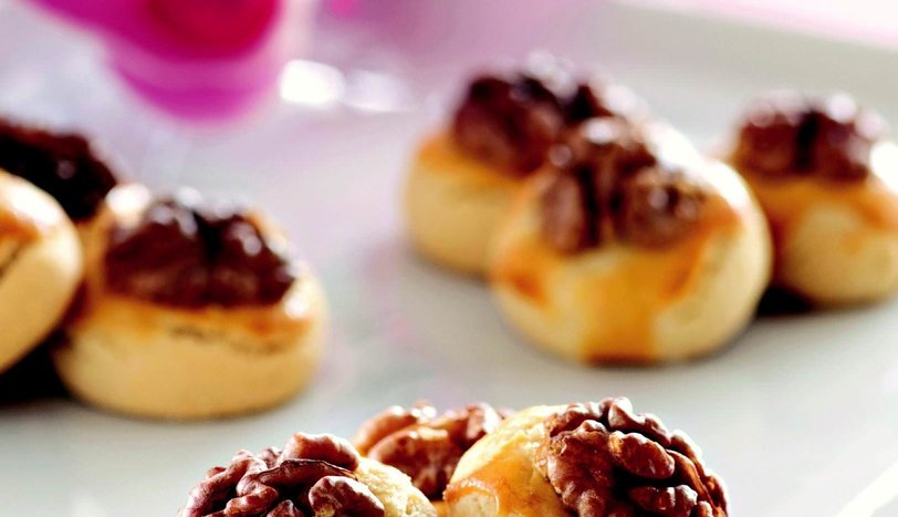 Hazırladığınız hamurdan ceviz büyüklüğünde parçalar koparın. Avucunuzda yuvarlayıp, üzerine bastırarak şekillendirin. Yağlı kağıt serilmiş bir fırın tepsisine yerleştirin. Üzerlerine yumurta sarısı sürün. Birer parça ceviz yerleştirin. Önceden ısıtılmış 150 derece fırında 20 dakika pişirin.