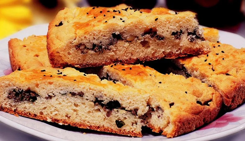 Soğanı yemeklik doğrayıp sıvı yağda hafifçe pembeleştirin. Üzerine kıymayı ilave edip kavurmaya devam edin. Tuz ve ince kıyılmış dereotunu ekleyip ocaktan alın ve soğumaya bırakın. Hamuru hazırlamak için önce margarini eritin. Soğuduktan sonra üzerine yumurta ve yoğurt ilave edin. Kek unu da ekleyip mikserle çırpın. 1 saat dinlendirin. Yağlanmış orta boy bir fırın tepsisine hamurun yarısını yayın. Üzerine kıymalı harcı koyun. Kalan hamuru üzerine kapatıp, çörek otu serpin. Önceden ısıtılmış 200 derece fırında üzeri kızarıncaya kadar pişirin. Dilimleyerek servis yapın.