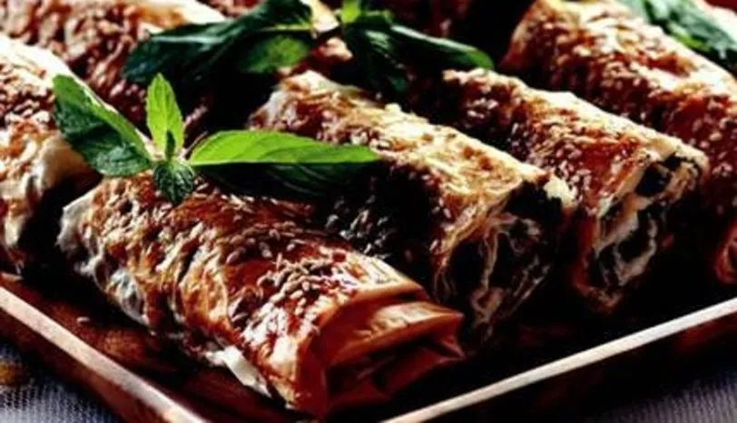 Harç için orta ateşte küp doğranmış soğanı zeytinyağında kavurun. Kıyma ekleyip, 4-5 dakika karıştırarak kavurmaya devam edin. Toz şeker, tuz ve karabiber ilave edin. Ocaktan alıp soğumaya bırakın. Ayrı bir yerde kuş üzümünü 10 dakika ılık suda dinlendirip suyunu süzdürün ve harca ekleyin. Bir adet baklavalık yufkayı tezgaha yayın. Sıvı yağ sürüp, üzerine ikinci yufkayı yerleştirin. Tekrar sıvı yağ sürüp, onun da üzerine üçüncü yufkayı yerleştirin. Kıymalı harcı nohut büyüklüğünde ve eşit aralıklarla serpiştirin. Yufkaların yırtılmamasına özen göstererek sıkıca rulo şeklinde sarın. Kalan yufka ve harca da aynı işlemi uygulayın. Her bir ruloyu 4 eşit parçaya kesin. Yağlanmış fırın tepsisine yerleştirip, üzerlerine yumurta sarısı sürün. Susam ve çörek otu serpip, önceden ısıtılmış 180 derece fırında, 30-35 dakika pişirin. Sıcak olarak servis yapın.