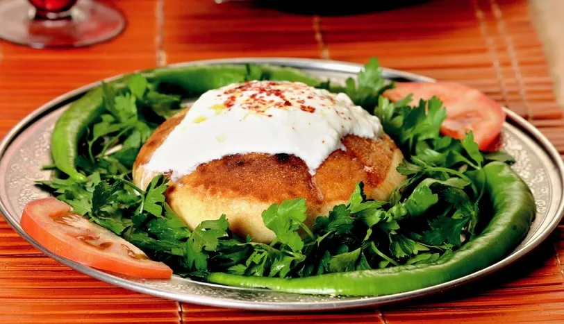 Bir kabın içinde un çeşitlerini karıştırın. Ilık suyu azar azar ilave edin. Kulak memesinden daha sert bir hamur elde edene kadar yoğurun. Mayalanması için yoğurt ve tuz ilave edin. Hamurun üzerini nemli bir bezle örterek 2 saat dinlendirin. Hamurdan portakal büyüklüğünde parçalar koparın. Her bir parçayı avucunuzun içinde döndürerek yuvarlayın. Üzerine nemli bez örterek 1 saat daha dinlendirin. Hamurları yağlanmış fırın tepsisine aralıklarla dizin. Önceden ısıtılmış 175 derece fırında 40-45 dakika pişirin. Ekmekler fırından çıktıktan sonra soğuması için bir kenara alın. Alt kısmının ortasını parmağınızla delerek ekmeğin içini boşaltın. İçi için kıymayı kendi yağında kavurun. Taze soğanın beyaz kısımlarını içine atın ve kavurmaya devam edin. Daha sonra sırasıyla taze soğanın yeşil kısımlarını, maydanozu, dereotunu ve naneyi ilave edin. Karabiber, tuz ve yağda kızarttığınız ekmek içini koyup bütün malzemeyi karıştırın. Ekmeklerin içini bu malzeme ile doldurun. Unla suyu bulamaç haline getirin ve açık olan yeri kapatın. Ekmek dolmalarını çok az yağda kızartın. Bir tencereye etsuyu ve tuzu koyup kaynatın. Ekmekleri bir tabağa dizin ve tencerenin üzerine yerleştirin. Et suyundan bir kepçeyle alıp dolmaların üzerine gezdirin. Ekmekler yumuşayana kadar işleme devam edin. Servis tabağına aldığınız ekmek dolmalarının üzerine sarmısaklı yoğurt dökün. Üzerine kırmızı biberli yağ gezdirip sıcak olarak servis yapın.