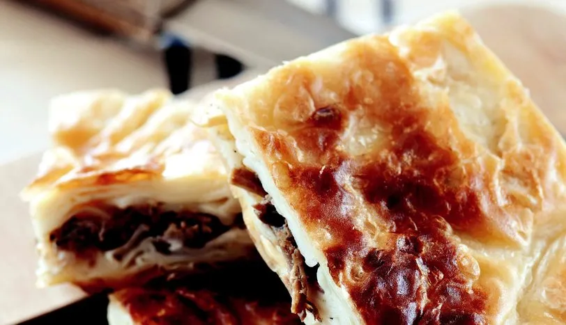 Harç için eti, iç yağı ve margarin ile kavurun. Ocaktan alıp soğumaya bırakın. Tuz ve kekik ilave edip karıştırın. Hamur için un, yumurta, sıvı yağ ve sütü iyice yoğurup sert kıvamlı bir hamur elde edin. 15 dakika dinlendirin. Hamurdan 8 beze koparıp oklava yardımı ile açın. Bir tencereye sıcak su, başka bir tencereye soğuk su koyun. Açtığınız bir adet yufkayı sıcak suya alıp 2 dakika dinlendirin. Sıcak sudan çıkarıp, soğuk suya atın. Soğuk sudan çıkarıp yağlanmış fırın tepsisine yerleştirin. Eritilmiş tereyağı gezdirip, üzerine harç serpiştirin. Kalan yufkaları da aynı şekilde hazırlayın. Tepsiyi ocak üzerinde çevirerek, böreği pişirin. Dilimleyip sıcak alarak servis yapın.