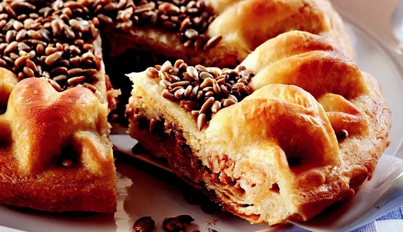 Yarım kg un hamur için un, instant maya, süt, yumurta, toz şeker ve tuzu derin bir kapta yoğurun. Üzerini nemli bir bezle örtün ve mayalanması için oda sıcaklığında yarım saat dinlendirin. Dinlenen hamuru 12 adet bezeye ayırın. Orta boy yuvarlak bir fırın tepsisini yağlayın. Hamurların üzerlerine un serperek merdane yardımıyla tepsinizin büyüklüğünde açın. 2 Hamurların aralarına sürmek için tereyağı eritip, sıvı yağ ekleyin ve karıştırın. Yufkaların büyüklüğündeki bir tepsiyi yağlayın ve 6 adet bezenin her birinin arasına tereyağlı karışımdan sürerek üst üste koyun. 3 İç malzemesi için yemeklik doğranmış soğanı, kıyılmış kırmızı biber ve sivri biberi tereyağında kavurun. Kabukları soyulup, küp doğranmış domates, tuz, karabiber ve pul biber katın. Domates suyunu bırakana kadar pişirin ve yumurtaları kırıp, tüm malzemeyi karıştırın. Yumurta pişince menemeni ocaktan alın ve rendelenmiş kaşar peyniri ile ayıklanmış ay çekirdeğini ekleyin. Şöyle bir karıştırdıktan sonra soğumaya bırakın. Hazırladığınız harcı üst üste konmuş 6 adet yufkanın üzerine boşaltın. Kalan 6 adet bezeyi de aynı şekilde hazırlayın ve menemenli karışımın üzerine üst üste koyun. Üzerine yumurta sarısı sürün. Önceden ısıtılmış 180 derece fırında üzeri kızarana kadar pişirin. Arzunuza göre ay çekirdeği ile süsleyin.