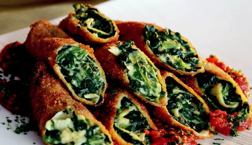 Krebi hazırlamak için, tüm krep malzemesini çırpma teli ile karıştırıp süzgeçten geçirin. Teflon tavayı hafif yağlayın. Krep hamurunu kepçe yardımıyla 2-3 mm kalınlığında tavaya dökün. Önlü-arkalı kızartarak kenara alın. İç malzemesini hazırlamak için, ıspanakları 2 dakika kaynar suda haşlayın. Çıkartarak buzlu suda şoklayın. İncecik kıyın. Tereyağını tavaya alarak eritin. Kıydığınız soğanı ilave ederek pembeleşene dek kavurun. Kıydığınız kırmızı biberi ilave edip 2-3 dakika soteleyin. Ispanakları ekleyerek 1-2 dakika daha kavurun. Karabiber ve tuzu ilave ederek karıştırın. Tepsiye alarak ılınmasının bekleyin. Kaşar peynirini de ilave ederek karıştırın. Hazırladığınız iç malzemesini kreplerin içine pay edin. Krebin iki kenarı harcın üzerine gelecek şekilde katlayın. Daha sonra sigara böreği şeklinde sarın. Önce una, daha sonra çırptığınız yumurtaya, en son galeta ununa bulayın. Sıvı yağda kızartarak kenara alın. Sos için, tereyağı ve zeytinyağını aynı tavada kızdırın. İnce kıydığınız soğanı ve sarımsağı ekleyin. Hafif pembeleştiğinde küçük doğradığınız domatesleri, salçayı, defne yaprağını, kekiği, isotu, tuz ve et suyunu ilave edin. Kısık ateşte 15-20 dakika kaynatıp soğumaya bırakın.