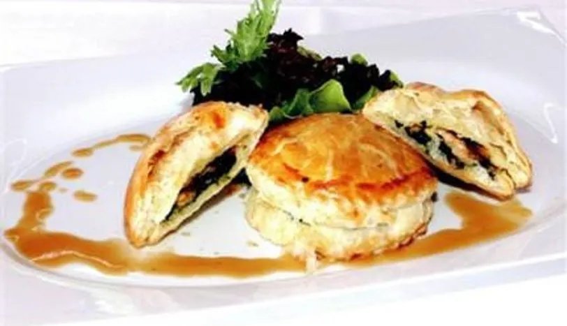 Bıldırcın göğsünü 2 tatlı kaşığı tereyağı ve kekikle birlikte soteleyin. Ayrı bir yerde mantarları kalan tereyağında soteleyin. Milföy hamurlarını merdane ile inceltin. 4 eşit yuvarlak parça olacak şekilde çay bardağıyla kesin. Milföy hamurlarının üzerine yumurta sarısı sürün. İki hamuru üst üste yerleştirin. Ortasına ıspanak, kıyılmış soğan ve bıldırcın göğsünü yerleştirin. Kalan iki hamuru üzerine kapatıp, kenarlarının açılmaması için elinizle bastırın. Önceden ısıtılmış 160 derece fırında 25 dakika pişirin. Sosu hazırlamak için, sardalyaları suda haşlayın. Süzüp, soğumaya bırakın. Kıyılmış soğan ve sarımsağı sıvı yağda karamelize olana kadar kavurun. Sardalya suyu, istiridye kabukları, defne yaprağı ve tuzu ekleyin. Ağır ateşte sos yaklaşık 1 su bardağı kalana dek pişirip, suyunu süzdürün. Unu tereyağda kavurun. Sosa ilave edip, ocağın altını kapatın. Bıldırcın göğsünü servis tabağına alın. İstediğiniz şekilde süsleyip, sosla birlikte servis yapın.
