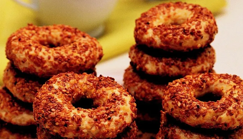 Margarin, yumurta akı ve 1 su bardağı kelle peynirini derin bir kaba alın. Üzerine unu eleyin. Karbonat ve mahlebi ilave edin. Tüm malzemenin karışması için iyice yoğurun. Hamurdan ceviz büyüklüğünde parçalar koparın. Bu parçaları iki avucunuzun içinde yuvarlayarak şerit şekli verin. Şeridin uçlarını birleştirin. Önce yumurta akına, daha sonra susama bulayıp önceden ısıtılmış 180 derece fırında pişirin.AŞÇININ NOTUKelle peyniri yerine eski kaşar da kullanabilirsiniz.