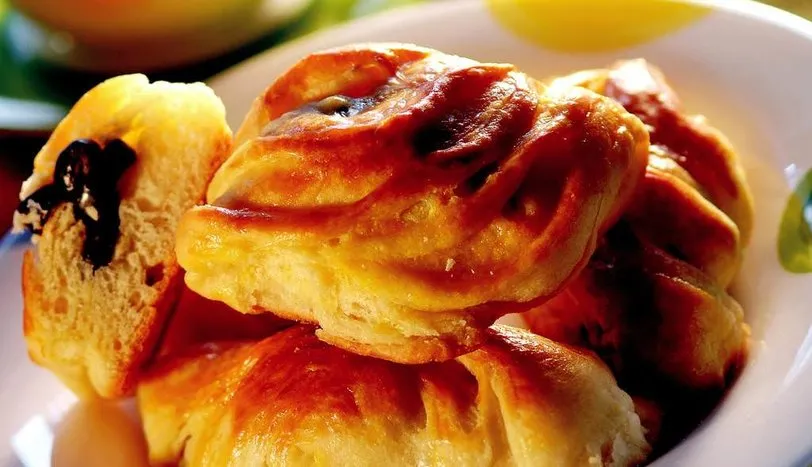 Bir kaseye unu eleyin ve kuru mayayı ekleyip harmanlayın. Ortasını havuz şeklinde açın ve bir yumurta ile diğer yumurtanın akını katın (sarısını üzerine sürmek için ayırın). Yoğurt, sıvı yağ, ılık su, tozş eker ve tuz ekleyip bütün malzemeyi yoğurun. Hamurun mayalanmasını beklemeden 4 eşit parçaya bölün. Her bir parçayı merdane ile orta büyüklükte açın. Birinci hamurun üzerine eritilmiş margarin ve tereyağı karışımından sürün. İkinci hamuru üzerine serin ve ikisini rulo şeklinde sarın. Diğer iki hamuru da aynı şekilde hazırlayın. Hamurları buzdolabında 1 saat bekletin. Buzdolabından çıkardığınız hamurları 2 parmak kalınlığında kesin. Elinizle hafifçe bastırıp büyültün. İç harç için dilimlenmiş siyah zeytin ve kekiği karıştırın. Hamurların ortalarına harçtan pay edin ve poğaça yapar gibi katlayın. Üzerine ayırdığınız yumurtanın sarısını sürün. Önceden ısıtılmış 170 derece fırında üzerileri hafif pembeleşene kadar pişirin.