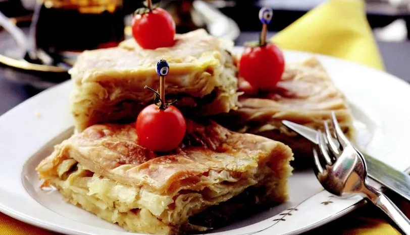 Harç için pırasaları halka doğrayıp, tereyağında soteleyin. Tuz, karabiber, kimyon ve pul biber ilave edip, karıştırın. Ocağın altını kapatıp, soğumaya bırakın. 9 adet milföy hamurunu üst üste gelecek şekilde yapıştırın. Merdane ile biraz açıp, yağlanmış fırın tepsisine yerleştirin. Üzerine pırasalı harcı yayın. Yufkayı didikleyip pırasalı malzemenin üzerine serpiştirin. Kalan 9 adet milföyü diğer 9 milföy gibi hazırlayıp yufkaların üzerine serin. Soda, süt, sıvı yağ ve yumurtayı iyice çırpıp, milföy hamurlarının üzerine sürün. Önceden ısıtılmış 200 derece fırında 35-40 dakika pişirin. Dilimleyip sıcak olarak servis yapın.