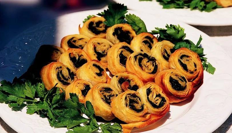 Zeytinyağı ve suyu bir kapta karıştırın. Yufkaların arasına bu karışımdan sürerek, üst üste koyun. Bir tavada ince kıyılmış taze soğanı, margarinle kavurun. Üzerine ince kıyılmış maydanoz ve pazıyı ilave edip karıştırın. Baharatları da ekleyip 5 dakika pişirin. Karışımı soğutup, yufkanın üzerine ince bir şekilde kaşıkla sürün. Yufkayı kenarlarından ortasına doğru iki taraftan rulo şeklinde katlayın (ortada birleşecek şekilde sarın). İki ruloyu ortadan keserek ayırın. Bir parmak kalığında yuvarlaklar kesip, yağlanmış tepsiye dizin. Önceden ısıtılmış 180 derece fırında 15 dakika pişirerek sıcak servis yapın.