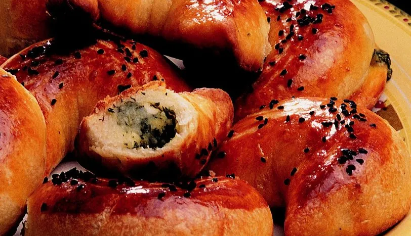 Genişçe bir kaba 1 su bardağı yoğurt, yağ, yumurta akı ve kabartma tozunu koyup karıştırın. Üzerine elenmiş un ve tuzu katın. Karışımı, kulak memesi yumuşaklığında, ele yapışmayacak bir hamur olana dek yoğurun. Elde ettiğiniz hamuru 15 dakika dinlendirin. Bu arada patatesleri haşlayıp ve bir kaba rendeleyin. Üzerine ezilmiş beyaz peynir, ince kıyılmış taze soğanların yeşil kısımlarını ve ince kıyılmış maydanozu ilave edin. İyice karıştırın. Hamurdan yumurta iriliğinde parçalar koparın. Hafifçe unlanmış bir zeminde, hamuru elinizle bastırıp, kahve tabağı büyüklüğünde açın. Bu işleme, parçalara ayırdığınız hamurlar bitene kadar devam edin. Hazırladığınız peynirli patatesli harcı hamurlara bölüştürüp, hamurun ortasına koyun. Rulo yaparak sarın. İki ucunu içe doğru büküp, parmak uçlarınızla inceltin ve ay şekli verin. Üzerlerine ayırdığınız yumurta sarısını sürün. Çörek otunu üzerine serpiştirin. Hafifçe yağlanmış fırın tepsisine dizin. Önceden ısıtılmış 180 derece fırında, pembeleşene dek pişirin.