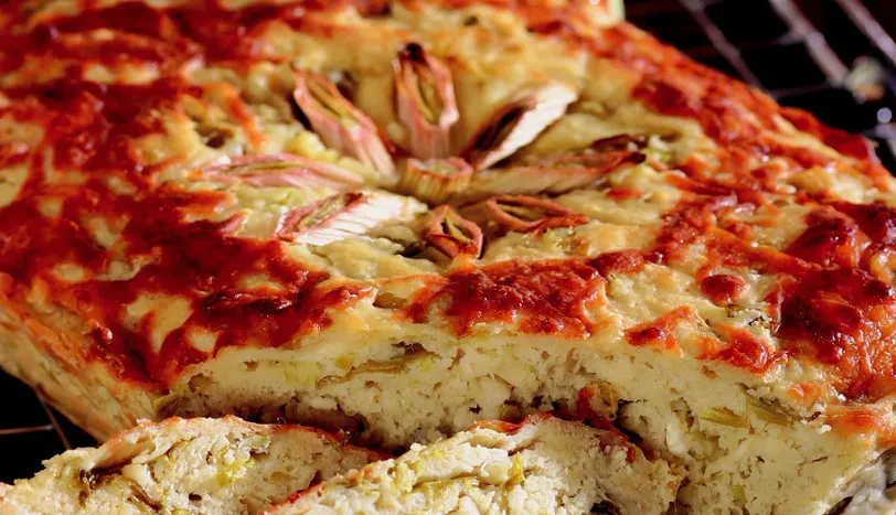 Pırasayı incecik kıyarak sıvı yağda soteleyin. Tuz, karabiber ve pul biberi ekleyerek karıştırın. Fırına dayanıklı derin bir cam kaseye boşaltın. İçine 3 adet yumurtayı kırın. Ayrı bir kapta, mayayı 1 su bardağı ılık süte katarak eritin. Diğer malzemeye katarak karıştırın. Lor peynirini, yoğurdu, 2 çorba kaşığı tereyağını ve kalan yumurtayı ilave ederek iyice karıştırın. Karışım kulak memesi kıvamı alana dek, un ekleyip yeniden karıştırın. Üzerine kaşar peyniri serpin. 200 derece fırında 40 dakika pişirip sıcak olarak servis yapın.