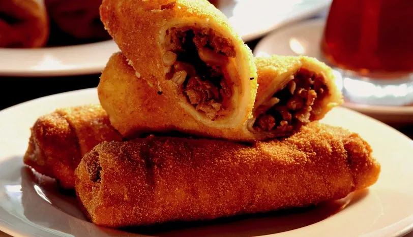 İnce kıyılmış soğanı sıvı yağda kavurun. Çok ince doğranmış beyaz lahana ve rendelenmiş havucu ilave edip kavurmaya devam edin. Kıyma, dolmalık fıstık, kuş üzümü, ceviz, tuz, karabiber ve kırmızıbiberi ekleyin. Bütün malzemeyi iyice kavurduktan sonra ılınması için bir kenara alın. Diğer tarafta yumurta akını çok az tuz ile çırpın. Sıvı yağı ilave edip tekrar çırpın. Birinci yufkayı tezgahın üzerine serin, üzerine yumurtalı harçtan sürün. İkinci yufkayı üzerine serin ve 8 adet üçgen olacak şekilde kesin. Üçgenlerin geniş kısmına kıymalı harçtan koyun ve yan kısımları içe katlayıp rulo şeklinde sarın. Diğer iki yufkaya da aynı işlemi uygulayın. Hazırladığınız ruloları önce çırpılmış yumurtaya daha sonra galeta ununa bulayıp, kızgın sıvı yağda arkalı önlü kızartın.