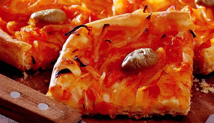 Ekmek hamurunu, 30 cm çapında ince kenarlı bir fırın kabına elinizle yayın. Diğer tarafta, piyazlık doğranmış soğanları, sıvı yağda hafifçe kavurun. Rendelenmiş 1 adet domates, tuz ve pul biber koyup, şöyle bir çevirin. Salça ekleyip, pişirmeye devam edin. Daha sonra, hamurun üzerine soğanlı harcı yayın. Önceden ısıtılmış 170 derece fırında üzeri kızarana dek pişirin.