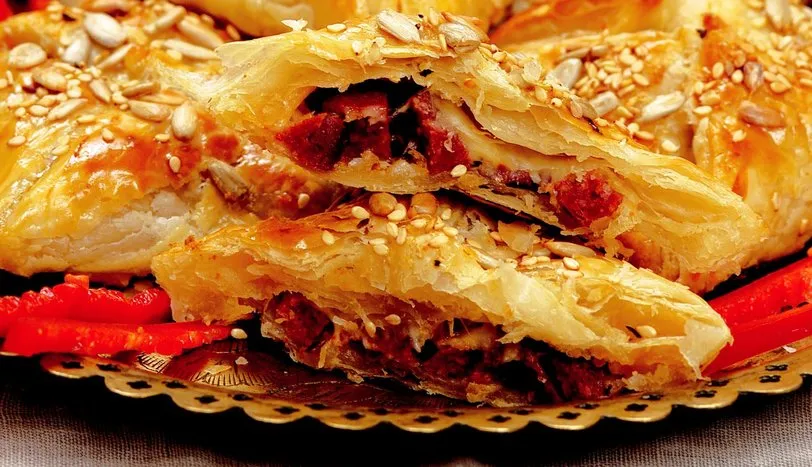 Milföyleri elinizde bastırarak hafifçe açın. Sucuk ve kaşar peynirini karıştırıp, milföylerin üzerine koyun. Milföyleri dört ucundan birleştirip, bohça biçiminde katlayın. Üzerine yumurta sarısı sürün. Ay çekirdeği ve susamı serpin. Önceden ısıtılmış 200 derece fırında üzeri kızarana dek pişirin. Sıcak servis yapın.