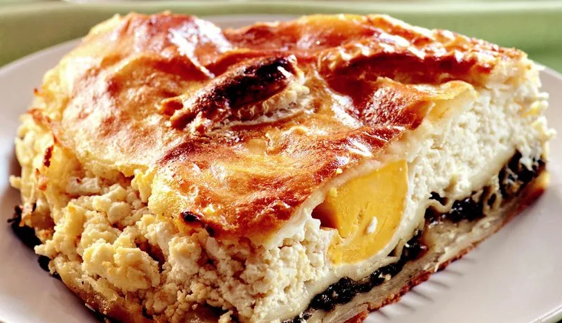 Hamur için un ve tuzu yoğurma kabına alın. Ortasını havuz şeklinde açın ve azar azar ılık su ekleyerek kulak memesi yumuşaklığında bir hamur elde edene kadar yoğurun. Hamurun üzerini nemli bir bezle örtün ve 15 dakika dinlendirin. Dinlenen hamuru 8 eşit parçaya ayırın ve 1 adet hamuru servis tabağından daha büyük, diğerlerini servis tabağı büyüklüğünde olacak biçimde un yardımıyla açın. İç malzeme için ıspanak yapraklarını önce kaynar suya daha sonra buzlu suya batırıp çıkarın. Kağıt havlu ile kuruladıktan sonra kıyın ve derin bir kaba alın. İçine rendelenmiş eski kaşar peynirinin yarısını, tuzu ve karabiberi katıp, karıştırın. Büyük boy kelepçeli kek kalıbı ebadında bir tepsiye, açtığınız bir adet büyük yufkayı kalıbın dışından 2 parmak taşacak biçimde yayın. Eritilmiş bir buçuk çorba kaşığı tereyağının içine fındık yağı katın ve yufkanın üzerine fırça yardımı ile sürün. İkinci yufkayı serip, üzerine tereyağı sürün. Bu işlemi 4 yufka üst üste konacak şekilde tekrarlayın. Dördüncü yufkanın üzerine ıspanaklı harcı yayın ve tekrar üç adet yufkayı aralarına yağ sürerek üst üste koyun. Ayrı bir kapta, kalan rendelenmiş eski kaşar peyniri, lor peyniri, muskat krema, eritilmiş bir buçuk çorba kaşığı tereyağı ve tuzu karıştırıp, yufkanın üzerine yayın. Lorlu karışımın üzerine de 6 adet yuva açın ve bu yuvalara yumurtaları kırın. Kalan 1 adet yumurtanın akını da orta kısma koyun ve üzerine kalan 1 adet yufkayı serin. Yufkanın üzerine yumurta sarısı sürün ve kenardan sarkan kısımları içe doğru katlayın. Önceden ısıtılmış 180 derece fırında üzeri kızarana kadar pişirin. Ilınınca dilimleyerek, servis yapın.