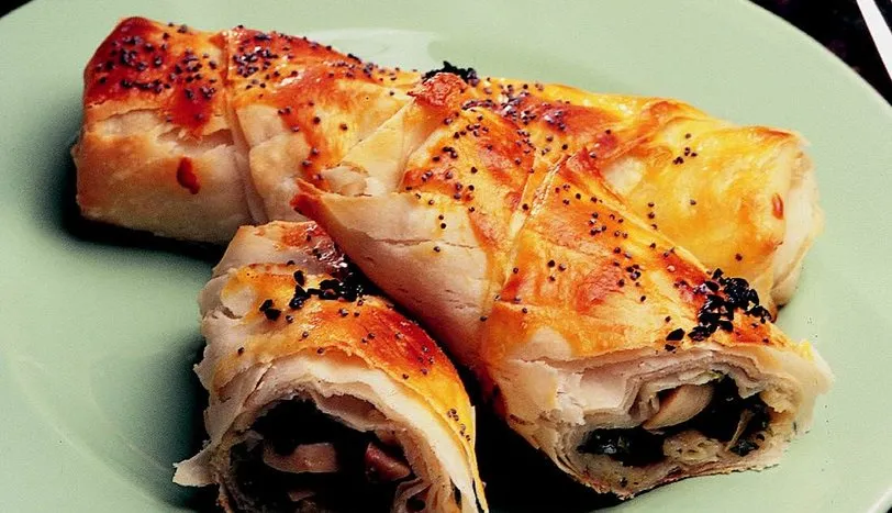 Mantarları boyuna dilimleyip, küp doğranmış soğan ile birlikte sıvı yağda soteleyin. Mantarlar bıraktığı suyu çektiği zaman tuz ve karabiber ekleyin. 1-2 dakika daha kavurduktan sonra, ince kıyılmış maydanoz, yumurta akı ve pul biber ekleyip karıştırarak, ılınmaya bırakın. Yufkaları eritilmiş margarinle yağlayıp üst üste serin. Sigara böreği keser gibi 8 veya 16 üçgen oluşturacak şekilde kesin. Üçgen yufkaların geniş kenarlarına iç harçtan koyup, sigara böreği sarar gibi sarın. Derin bir kaseye aldığınız sütün içine hazırladığınız börekleri koyup yarım saat bekletin. Daha sonra bir süzgecin içine börekleri alıp süzülmesi için 5 dakika bekletin. Hafif yağlanmış ve unlanmış minik fırın tepsisinin içine börekleri dizin. Buzdolabında 2-3 saat beklettikten sonra üzerlerine yumurta sarısı sürün. Önceden ısıtılmış 220 derece fırında üzerleri kızarana kadar pişirin. Sıcak ya da ılık olarak servis yapın.