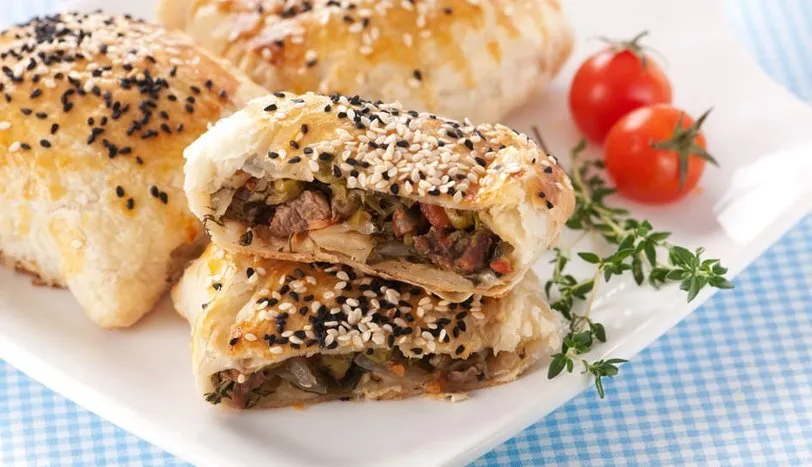 Yağı tencereye alın ve eritin. Üzerine et, tuz ve karabiber ekleyin. Suyunu salıp çekene kadar kavurun. Piyazlık doğranmış soğanı ilave edin. Soğanın rengi dönene kadar kavurun. Kıyılmış sivri biber ve rendelenmiş domatesi de ekleyin. Birkaç dakika kavurup, bezelyeyi ilave edin ve suyunu çekene kadar kısık ateşte kavurun. Üzerine kıyılmış dereotu ve maydanoz ekleyin. Karışımı biraz ılıtın. Oda sıcaklığında beklettiğiniz milföy hamurlarının ortasına hazırladığınız harçtan koyup bohça şeklinde kapatın. Börekleri yağladığınız fırın tepsisine ters çevirip yerleştirin. Üzerlerine yumurta sarısı sürün. Susam ve çörek otu serpin. Önceden ısıtılmış 180 derece fırında üzerleri kızarana kadar pişirin.AŞÇININ NOTUTalaş böreği yaparken, milföy hamurlarını kullanmadan önce oda sıcaklığında 5 dakika kadar bekletirseniz şekillendirmeniz daha kolay olacaktır.